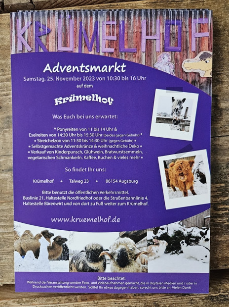 Samstag, 25. November 2023 von 10:30 bis 16 Uhr auf dem Krümelhof Was Euch bei uns erwartet: Ponyreiten von 11 bis 14 Uhr & Eselreiten von 14:30 Uhr bis 15:30…